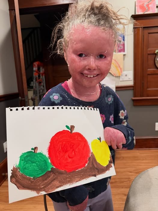 That is exactly what happened when an image of a little girl proudly holding her painting — bright apples in green, red, and yellow — exploded across American social media this week.