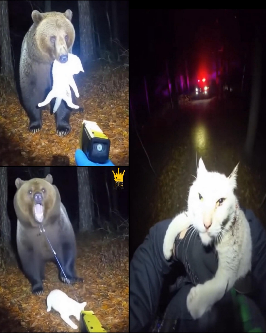 The officer freezes. The growl grows louder, closer. He turns, and in that split second, his bodycam captures the impossible: a massive black bear emerging from the underbrush, its jaws clamped around a small, limp shape — a cat.