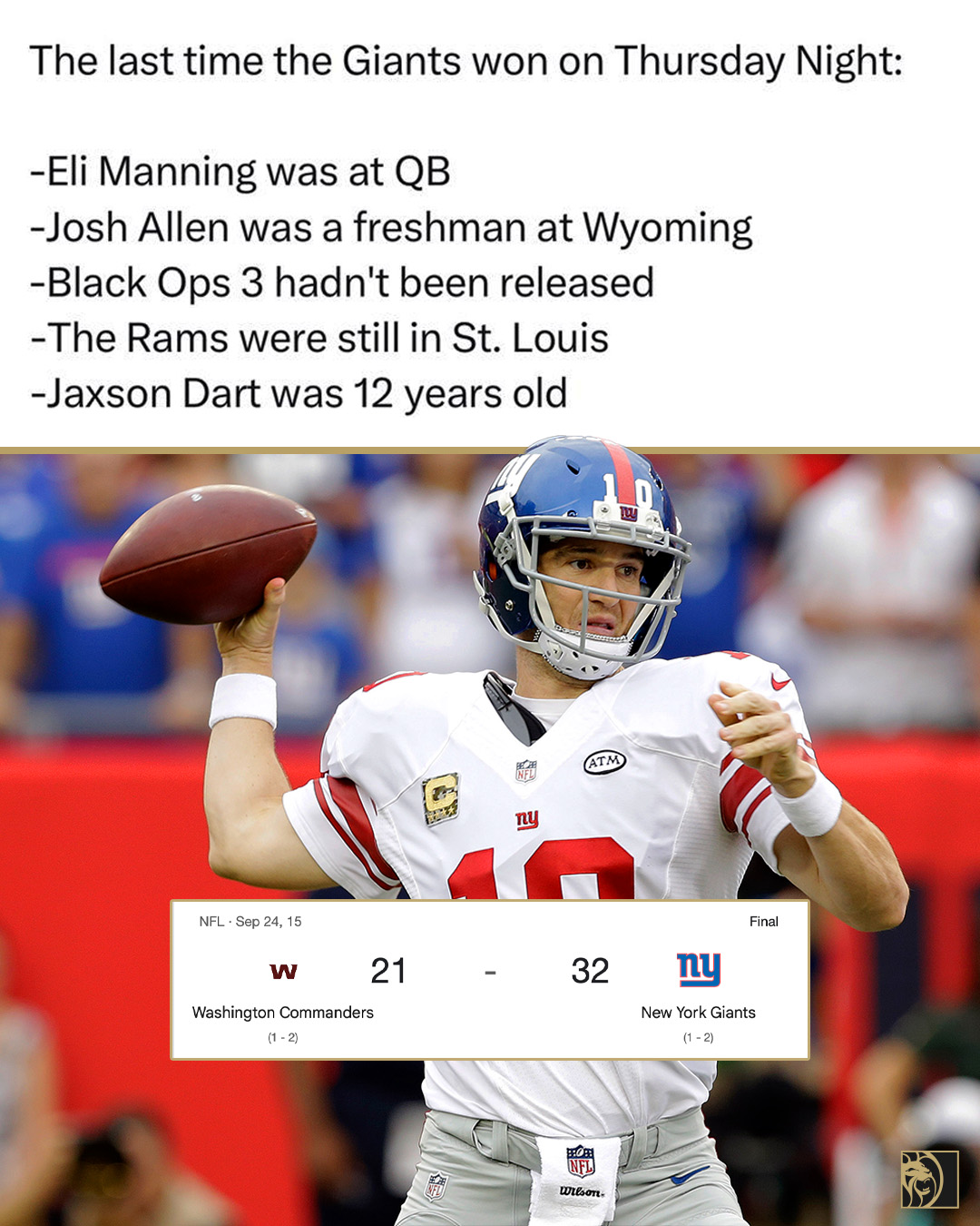 The main purpose of the meme is to create a sense of how much time has passed. By invoking cultural touchstones (video games, team relocation, player age), the creator emphasizes that the Giants’ last TNF victory belongs to an “ancient era” in NFL history.