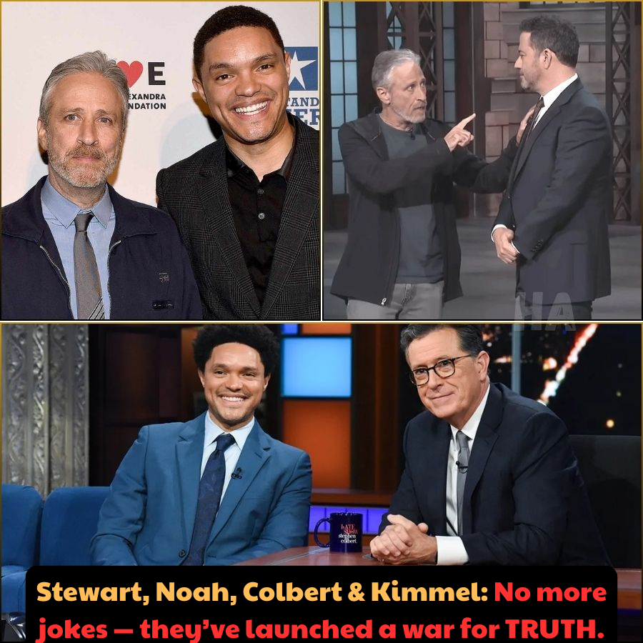 For years, these four icons of American late-night television have made millions laugh with sharp wit and fearless satire. But now, the laughter carries a heavier weight — one that challenges silence, censorship, and the corporate control of speech. Jon Stewart, Trevor Noah, Stephen Colbert, and Jimmy Kimmel — longtime rivals turned allies — have united under a new banner: “The Truth Program.”