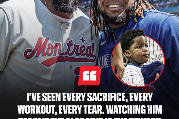 This image is a warm and proud moment, capturing the emotional congratulatory message from baseball legend Vladimir Guerrero Sr. to…